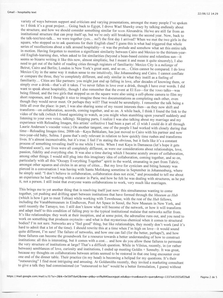 Cada artista/curador elige una pieza de la colección del FRAC y propone a otra persona en la cadena, quien debe escoger una pieza relacionada con la última pieza elegida, y luego selecciona a la siguiente persona que, a su vez, añade otra pieza a la exposición. Yo escogí un performance titulado Intime & Personnel, de Ester Ferrer y Tania. En respuesta, seleccionó una foto de Tom Marioni. No sé si alguna de las dos veremos la exposición, que se inaugura este mes, pero parecía una forma interesante de reconectarnos. Me da curiosidad saber qué anda haciendo Galia Eibenschutz y por alguna razón sigo pensando en el destino del pajarito que se cayó del nido afuera de su estudio. Ximena, de Proyectos Monclova. Hoy con Shumon Basar nos acordamos de ella al hacer una lista de nombres que nos gustan y que empiezan con X. Proyectos Monclova presentó a Christian Jankowski en el Sunday Fair a principios de este mes (el Sunday Fair estuvo súperbien, comparado con Frieze y con otras ferias en general). Pensé que posiblemente me toparía a Ximena allí, pero no fue así. Recuerdo una larga conversación sobre Tercerunquinto, cuando visitamos el espacio, pero tendría que revisar mis notas para recordar por qué surgió. Tengo que depender más de mis notas que de mi memoria. Otra nota mental que quiero compartir contigo viene del mismo viaje: le quiero escribir a Magali Arriola. Tuvimos una larga junta mientras desayunábamos (en un lugar estupendo que es casi todo azul y que, por alguna razón, en mi memoria aparece como “Matisse”) y desde entonces la cuestión de cómo curar una exposición geotemática, en forma figurativa más no de tropo, persiste en mi mente de maneras variadas —no tiene que ver con Matisse, más bien con la conversación que tuve con Magali, con demasiado café y comida deliciosa—. Sin embargo, me sigue intrigando SOMA, porque me parece que la estructura es muy buena, pero funciona de maneras diversas, entre el apoyo, la crítica y presentaciones variadas, rodeada de mucha gente con la cual he hablado. Me parece un proyecto estupendo… Al regresar de Egipto creo que volví loco a Wael Shawky hablándole sin parar de la estructura y de que deberíamos pensar en algo parecido para MASS Alexandria. Aún estamos lejos de una estructura institucional que pueda sostenerse, pero hemos iniciado el segundo año. Ahora, volviendo a la plática-texto/texto-plática… ¿estábamos juntas (sí… ¿no?) el primer día que llegué?, ¿cuando nos detuvieron las dos jovencitas en la plaza y nos hicieron preguntas para su clase de inglés? Creo que eso es lo que detonó toda esa serie de recuerdos relacionados con una plática sobre la hospitalidad —fue el preludio y de alguna manera lo que echó a andar toda esta conversación—. Y después de que haya olvidado mencionarle al dúo de estudiantes de inglés, de trece años, una importante similitud entre El Cairo y México cuando me pidieron que enumerara las similitudes (además del hecho de que ambas ciudades tienen una dieta basada en frijoles y un sol implacable, suena tan raro ahora que lo escribo, casi simplista, pero lo dije en serio y sinceramente lo pienso), también tengo que dejar de interpretar a las ciudades mediante el registro de lo conocido: México es una mezcla de Beirut, El Cairo y Berlín; Londres es la tía abuela de Nueva York, etc. No se puede comparar a las ciudades. Pero sí me encanta que de forma intuitiva entiendo a México, como a Johannesburgo o El Cairo. No puedo combinar o comparar a las tres, siguen siendo por completo diferentes y sólo se parecen 90 en la sensación de familiaridad que generan. Las ciudades son como las parejas: puedes acabar enamorándote tras décadas de conocer a la otra persona o después de un sólo trago —con eso basta—. Nunca me he enamorado después de un solo trago, pero sí después de unas palabras. Sí, quería hablar de hospitalidad, aunque también recuerdo que estaban filmando el evento en El Eco para las pláticas de Tomo, y las dos jovencitas que nos detuvieron en la plaza también estaban usando las cámaras de sus celulares para grabar mis cortas respuestas y pensé que sería lindo imaginarse estas dos grabaciones juntas, como complemento, aunque nunca se encontrarían. ¿O quizá sí? Eso sería una buena casualidad. Recuerdo que la plática resultó un poco enredada: en parte estaba también compartiendo mi interés en ese momento —así como ahora cambia de dirección y se transforma— en la colaboración, los acuerdos, aunar esfuerzos, etcétera. Hace algún tiempo, creo que encontré el link para el video de la plática (sufrí mucho al verlo, como puede suceder cuando casualmente te encuentras a ti misma y escuchas tu propia voz al hablar). Me salté algunas partes y me di cuenta de que también estaba hablando de mi matrimonio y de mi experiencia con Reloading Images, el colectivo de artistas al que pertenecí. (Me encantaría poder hacerlo todo con el codificador de voz de Laurie Anderson.) En otra tangente, una de las personas con las que trabajé muy de cerca en esa época —época de Reloading Images, por ahí del año 2008—, Kaya Behkalam acaba de mudarse a El Cairo con su pareja y con Selma, su hija de dos años. Me imagino que sólo es relevante en relación con lo rápido que pasa el tiempo y cómo transforma vidas. Es casi inconcebible, pero es cierto. Creo que estoy diciendo lo obvio, pero se siente como un proceso constante de algo que se me manifiesta mientras escribo. Cuando conocí a Kaya en Damasco (¡esperemos que se libere pronto!), nuestras vidas eran por completo diferentes, así como nuestras ideas sobre las relaciones, el amor, la pasión, la fidelidad y todo lo demás. También era una época en la cual me volví sumamente consciente de la colaboración, entre otras cosas. Todavía me conectaba con esta idea imaginaria de la colaboración, de aunar esfuerzos, etcétera, en particular con el ánimo que había en