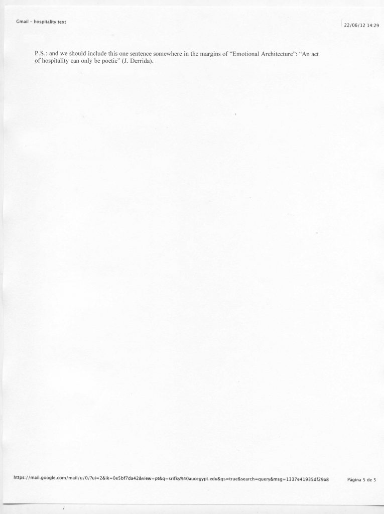 Espero que te encuentres bien y feliz. Te pido una disculpa por haberme tardado tanto en responder en relación con la publicación del texto que escribí (hablé) en El Eco, cuyos vestigios están empezando a formar parte de Arquitectura emocional 2011 y de un correo electrónico dirigido a ti. Volví a leer mis notas sobre el “texto de la hospitalidad”, como ya lo estamos llamando (no puedo realmente llamarlo un texto como tal), y pensé que quizá sería mejor simplemente escribirte sobre él, como yo lo recuerdo, en partes, para así revisar mi visita a México en mayo (o al revés). El tiempo parece tener tanta prisa y no puedo creer que ya hayan pasado tantos meses desde entonces (pero sigue siendo 2011, un año que pasó tan lento y, al mismo tiempo, tan rápido). Les agradezco a ti y a Tobias por haber sido unos anfitriones tan maravillosos, y a todos los de El Eco, así como al equipo de Tomo. Hay conversaciones que quisiera anotar —ya que continuamente las evoco— y retomar en algún momento. Recuerdo cuando “llegué”, quizá cuando conocí a Moris en El Eco y sostuvimos una conversación completa en español e inglés, cada uno sin el otro idioma, mientras observábamos su obra. Nos malentendimos y, por lo mismo, nos entendimos a la perfección. Me hizo dar unos pasos hacia adelante, rompiendo mi barrera del idioma. Me acuerdo que mis primeros encuentros con Diego Berruecos y Omar Barquet fueron edificantes —¡ambos con tanta energía y determinación!—. Ya sé que me estoy saltando recuerdos mientras escribo, pero seguramente resurgirán en otro lado —siempre sucede así—. Conocer a Carlos Amorales me cautivó, así como el lugar al que llegamos con nuestra conversación, su fascinante “máquina impresora a lápiz” y sus ideas sobre la educación artística. Hemos estado en contacto y comentamos su archivo de iconos convertido en escritura ilegible o en un lenguaje codificado, posiblemente con ojos que no eran los que implicaba nuestra conversación. También fue lindo leer sus ideas y las de Tobias (¡todavía no puedo creer que esté en Miami!). Hace poco vi a Mario García Torres en Londres: organizó una noche de cocteles inventados por artistas en el Bistrothèque (donde acabé olvidando mi tarjeta de crédito). Me tomé un “Rosie Nashashibi” que tenía tequila, me parece, y justo antes o justo después le escribí y la voy a ver la semana próxima en Turín. No la he visto desde que estuvo en El Cairo a finales de 2009. Una vez más, el tiempo, tiempo, tiempo. He querido retomar una conversación sobre el aplauso, entre otras cosas, con Tania Pérez (no sabes cuánto te agradezco habernos presentado: visitarla en su estudio y platicar con ella fue como bailar dubstep al ritmo de la filosofía continental). Como no he podido llegar a esa conversación todavía (así como uno no baila lo suficiente y lee menos de lo que se propone), la invité a participar en una propuesta que se está llevando a cabo en el FRAC Lorraine este mes por invitación de Justin Moore, para curar una exposición en cadena sobre grados de separación (me parece que más bien en el sentido de afinidad o proximidad).